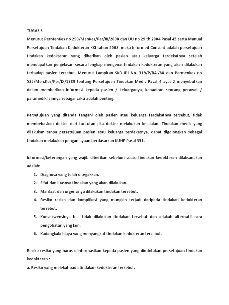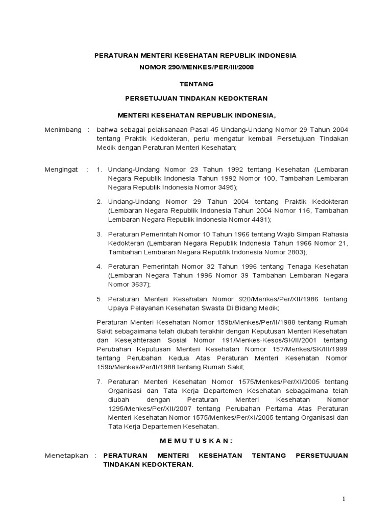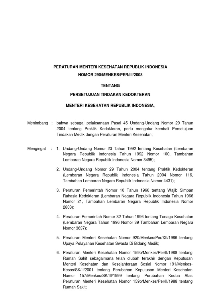 Untuk Permenkes 290 Tahun 2008. Permenkes 2902008 tentang persetujuan tindakan medis inform consent.
