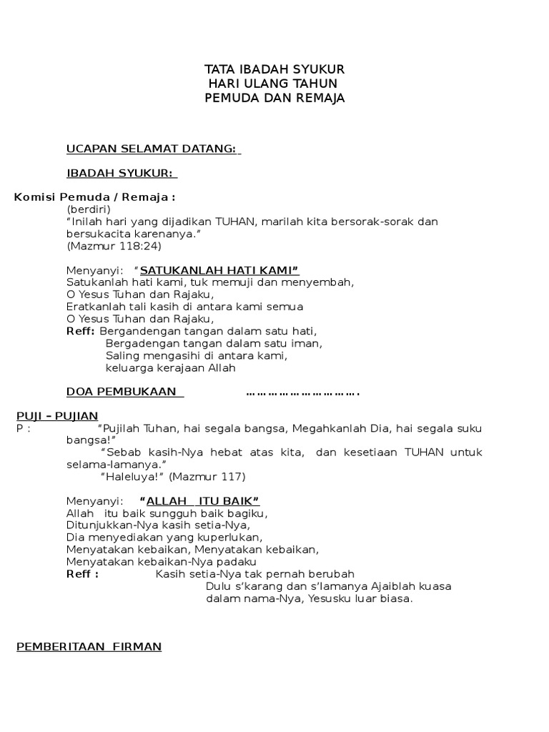 Kami bermohon kepadaMu kiranya Dikau menyucikan kami dari dosa dan kesalahan agar ibadah yang kami lakukan berkenan kepadaMu. Paus Pius XII Arsip Ibadat Syukur Ulang Tahun Katolik. Kami bersyukur atas kesempatan yang indah yang Tuhan sediakan bagi kami.