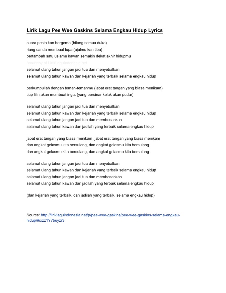 Lirik Lagu Pee Wee Gaskins - Selama Engkau Hidup Suara pesta kan bergema hilang semua duka riang canda membuat lupa ajalmu kan tiba bertambah satu usiamu kawan semakin dekat akhir hidu. Yang Hidup Bagimu By. Yuk baca artikel lirik lagu lainnya dengan mengikuti tautan ini.