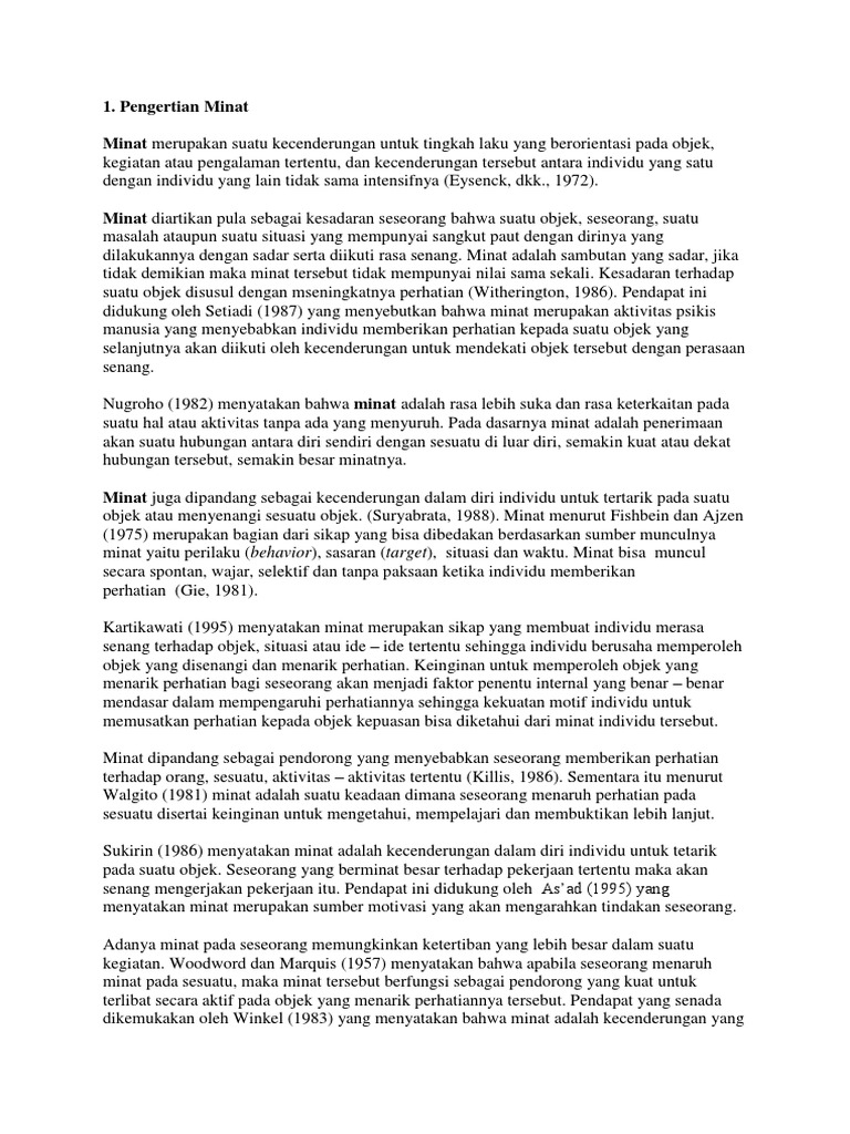 Perhatian terhadap obyek yang diminati secara sadar dan spontan wajar tanpa paksaan. Perhatian terhadap objek yang diminati secara sadar spontan wajar tanpa paksaan. Minat bersifat pribadi atau berkaitan dengan perbedaan individual dan berkembang sejak awal kanak-kanak Crow dan Crow 1963.
