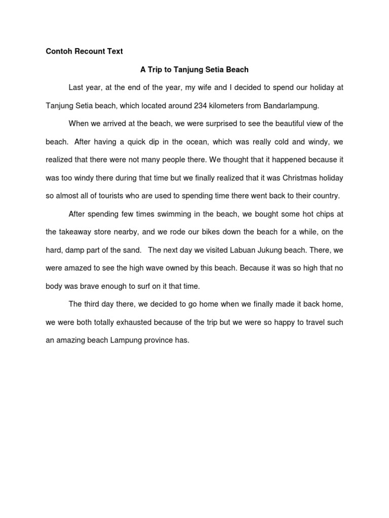 Silahkan tuliskan saja melalui kolom komentar di bawah. We arrived in the afternoon and took taxi to my grandparent house which was very close to the sea. Berikut contoh recount text singkat tentang liburan yang kita sajikan dalam bentuk bahasa Indonesia.