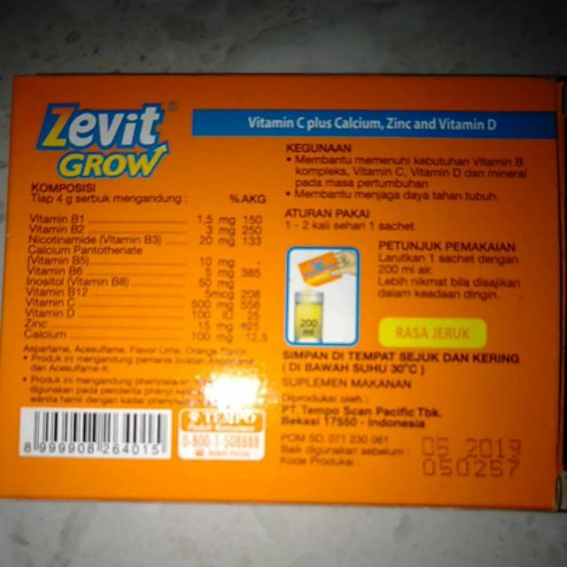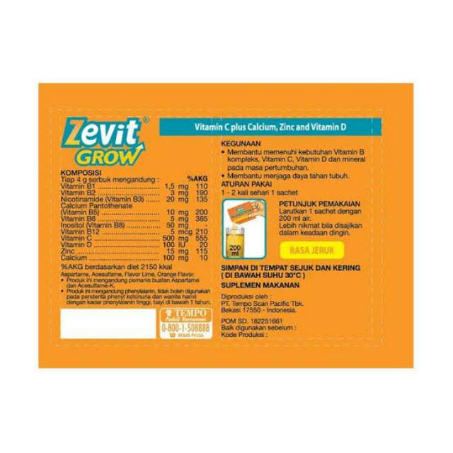 Multivitamin Zevit Grow dalam bentuk serbuk dan kaplet. Kandungan Zevit Grow Sachet. Tidak sebatas itu saja vitamin B juga diperlukan pada proses metabolisme lemak protein dan karbohidrat menjadi cadangan energi.