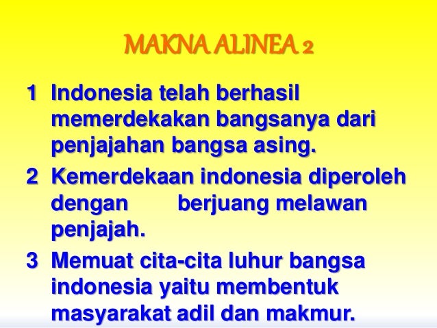 Makna alinea ke 2. Makna alinea ke 123 dan 4 pembukaan UUD 1945. Penjajahan harus dihapuskan dari muka bumi karena tidak sesuai dengan perikemanusiaan dan. Kemerdekaan adalah hak segala bangsa.