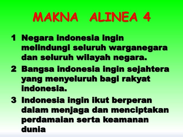 Makna alinea dalam pembukaan Undang-Undang Dasar 1945 tersebut disusun menurut suara masing masing alinea yakni alinea I alinea II alinea III dan alinea IV. Makna alinea ke-4 UUD 1945 adalah rumusan berdirinya negara Republik Indonesia dan tujuan yang akan dicapai yaitu memajukan kesejahteraan umum mencerdaskan kehidupan bangsa dan ikut melaksanakan ketertiban dunia yang berdasarkan kemerdekaan perdamaian abadi dan keadilan sosial. Dalam pernyataan tersebut terdapat dukungan kemerdekaan untuk setiap bangsa dan bangsa Indonesa memiliki kewajiban untuk terus berjuang melawan penjajahan yang ada.