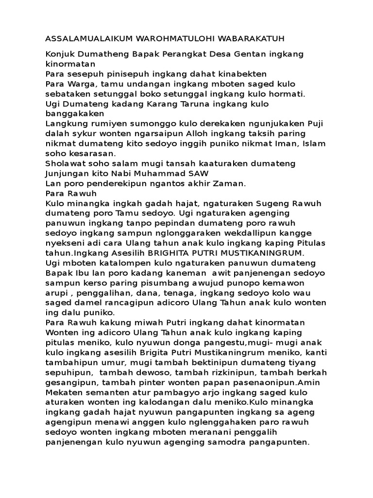 Pidato bahasa Jawa bisa disampaikan pada acara ulang tahun dan biasanya disampaikan oleh orang yang lebih tua misalnya saja oleh orang tua untuk menyambut ulang tahun buah hati. Konjuk Dumatheng Bapak Perangkat Desa Gentan ingkang kinormatan. Contoh muqaddimah atau pembukaan pidato ceramah dan khutbah.