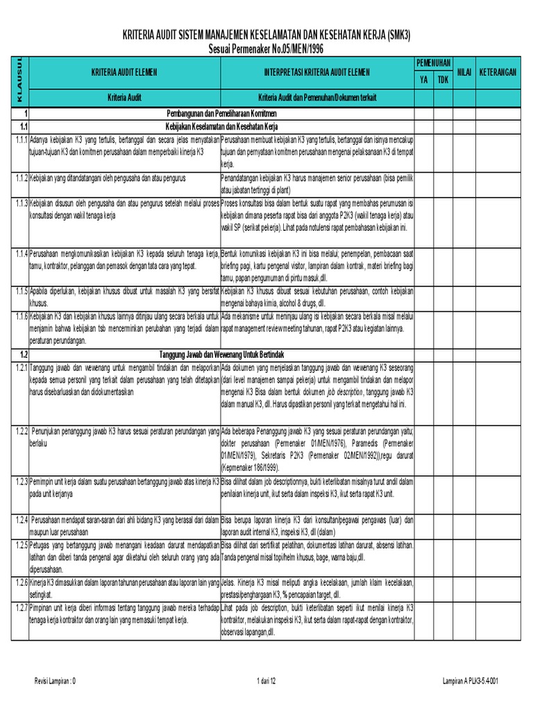 Laporan audit didistribusikan kepada manajemen dan petugas lain yang berkepentingan. Checklist Elemen SMK3 PP 50 Tahun 2012. Checklist Audit Smk3 Berdasarkan Pp No 5.