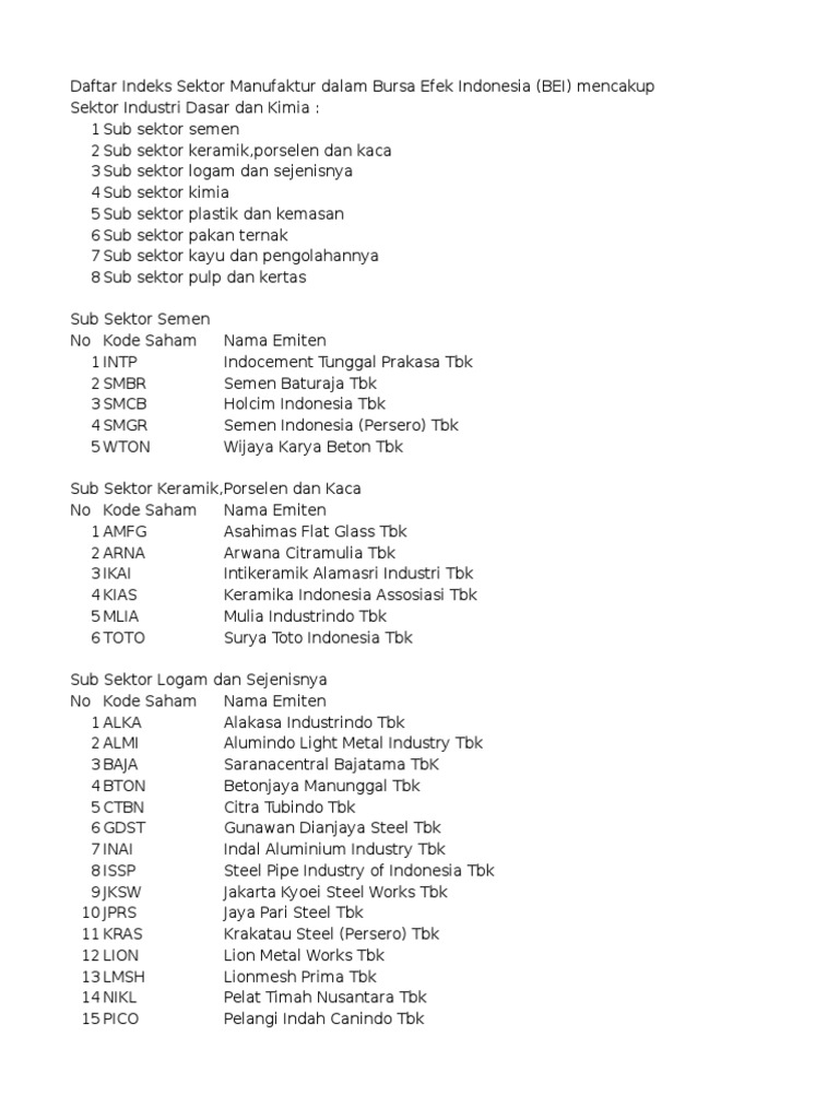 Daftar perusahaan manufaktur industri pengolahan di BEI meliputi sektor industri dasar dan kimia aneka industri sektor industri barang konsumsi. Sub sektor keramik porselen dan kaca. Sektor Industri Dasar Kimia.