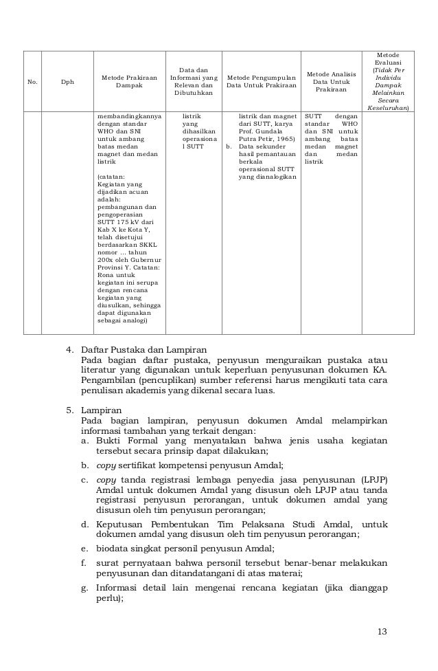 NOMOR 16 TAHUN 2012 TENTANG PEDOMAN PENYUSUNAN DOKUMEN LINGKUNGAN HIDUP PEDOMAN PENYUSUNAN DOKUMEN RKL-RPL A. Dalam Permen LH No16 tahun 2012 selain di sebutkan diatas salah satu kriteria penapisan untuk menentukan apakah suatu dampak potensial dapat menjadi DPH atau tidak adalah dengan menguji apakah pihak pemrakarsa telah berencana untuk mengelola dampak tersebut dengan cara-cara yang mengacu pada Standar Operasional Prosedur SOP tertentu pengelolaan yang menjadi bagian. 5285 LL SETNEG.