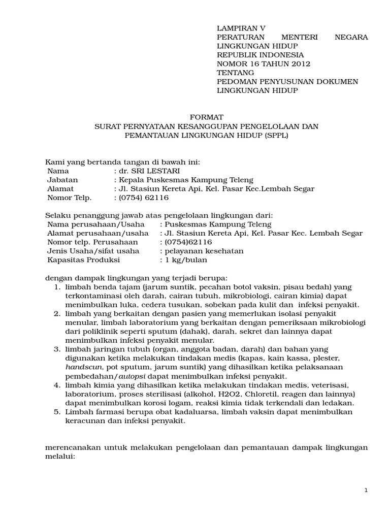 Peraturan Pemerintah PP TENTANG Izin Lingkungan. NOMOR 16 TAHUN 2012 TENTANG PEDOMAN PENYUSUNAN DOKUMEN LINGKUNGAN HIDUP FORMAT SURAT PERNYATAAN KESANGGUPAN PENGELOLAAN DAN. Peraturan Pemerintah PP ini mulai berlaku pada tanggal 23 Februari 2012.