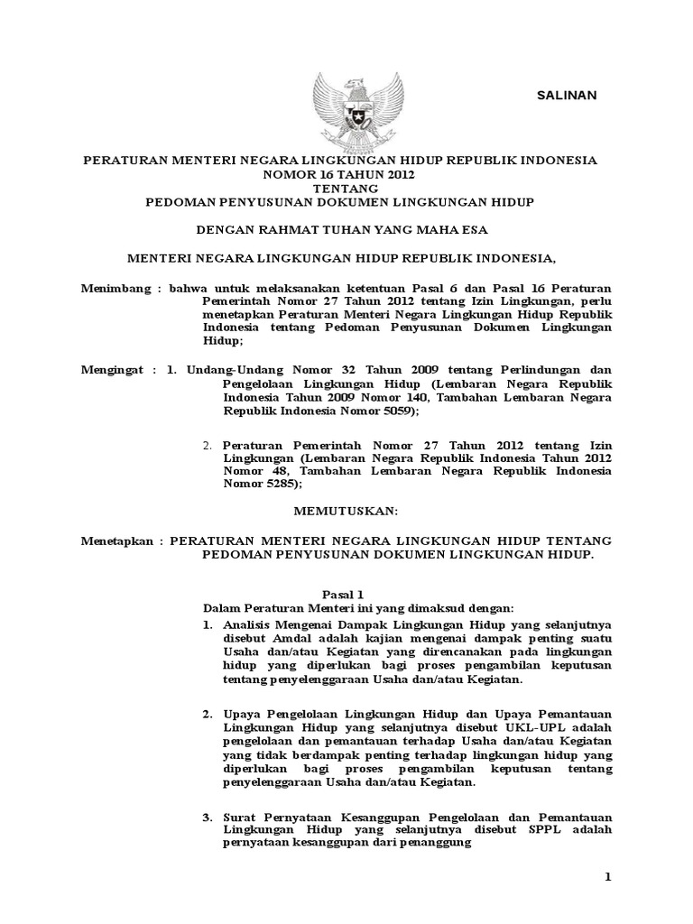 17 Tahun 2012 1. NOMOR 16 TAHUN 2012 TENTANG PEDOMAN PENYUSUNAN DOKUMEN LINGKUNGAN HIDUP DENGAN RAHMAT TUHAN YANG MAHA ESA MENTERI NEGARA LINGKUNGAN HIDUP REPUBLIK INDONESIA Menimbang. Undang-Undang Nomor 32 Tahun 2009 tentang Perlindungan dan Pengelolaan Lingkungan Hidup Lembaran Negara Republik Indonesia Tahun 2009 Nomor 140 Tambahan Lembaran Negara Republik Indonesia Nomor 5059.
