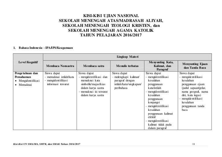 Indikator Kimia kisi. Pos tentang kisi-kisi soal UN 20142015 yang ditulis oleh Urip Rukim. Kisi Kisi UN Bahasa Indonesia IPAIPSKeagamaan SMA MA 2016 Sahabat Sekalian pada kesempatan kali ini Pojok Ilmu akan share mengenai Kisi kisi Ujian Nasional UN Untuk Bidang Studi Bahasa Indonesia IPAIPSKeagamaan UN SMA 2016.