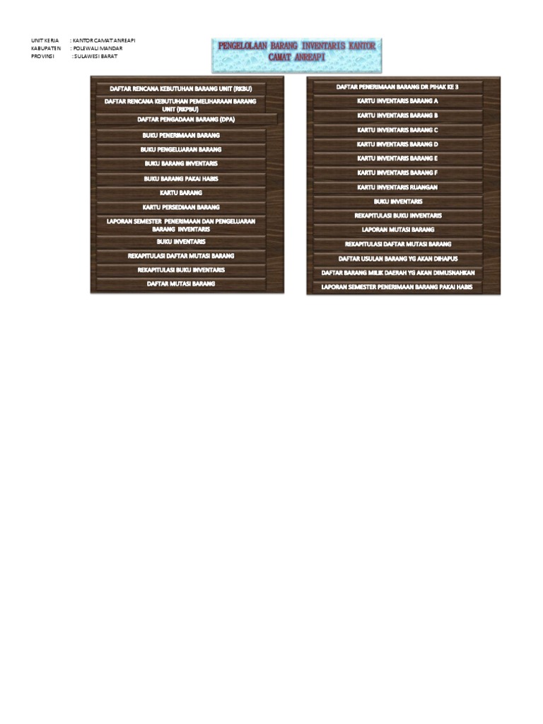 Diisi kondisi keadaan barang seperti Baik Rusak Ringan atau Rusak berat Kolom 1516. Tentang PEDOMAN TEKNIS PENGELOLAAN BARANG MILIK DAERAH Pada dasarnya penatausahaan assetBarang apapun bentuknya Milik Negara Daerah adalah sama dengan pengecualian pada penyimpanan bukti kepemilikan asli untuk asset Tanah dan Bangunan yang ditetapkan harus diserahkan kepada. NamaJenis Barang 1 2 MerkType Ukuran 3 Jumlah Barang 4 Harga Satuan Rp 5 Jumlah Biaya Rp 6 Nip.