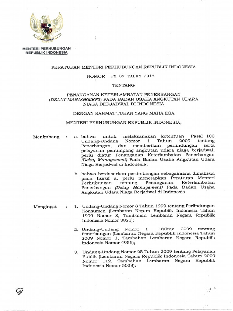 Peraturan Menteri Perhubungan TENTANG Perubahan Atas Peraturan Menteri Perhubungan Nomor Pm 77 Tahun 2011 Tentang Tanggungjawab Pengangkut Angkutan Udara. Salah satu yang ramai dibicarakan adalah maskapai penerbangan yang delay lebih dari 4 jam wajib memberikan ganti rugi Rp 300 ribu bagi tiap penumpang. Peraturan Menteri Perhubungan Nomor PM77 Tahun 2011 tentang TANGGUNG JAWAB PENGANGKUT ANGKUTAN UDARA.