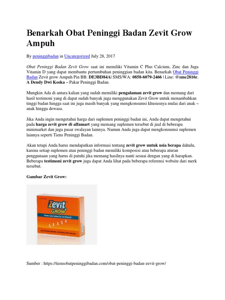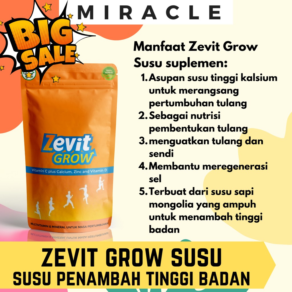 Zevit Grow merupakan salah satu multivitamin dan mineral seperti vitamin D vitamin C kalsium Seng serta mineral lainnya yang mampu menunjang pertumbuhan terutama pada usia remaja. Harga Zevit Grow Zevit Grow merupakan suplemen yang berfungsi untuk menambah tinggi badan selain itu dengan kandungan vitamin yang terdapat di dalamnya. Juga mampu memberikan nutrisi pada tubuh anak agar daya tahan tubuhnya tetap terjaga sehingga tidak mudah sakit.