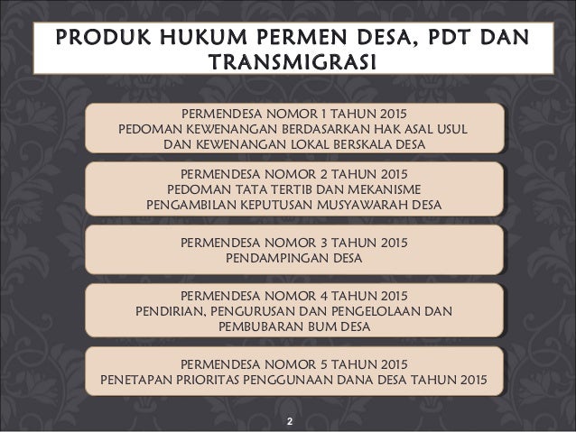 Permendesa no 5 Tahun 2015 Tentang Penetapan Prioritas Penggunaan Dana Desa Tahun 2015. Download KLIK DISINI Permendesa No21 Tahun 2015 Tentang Penetapan Prioritas Penggunaan Dana Desa Tahun 2016. Permendagri No1 Tahun 2017 Tentang Penataan.