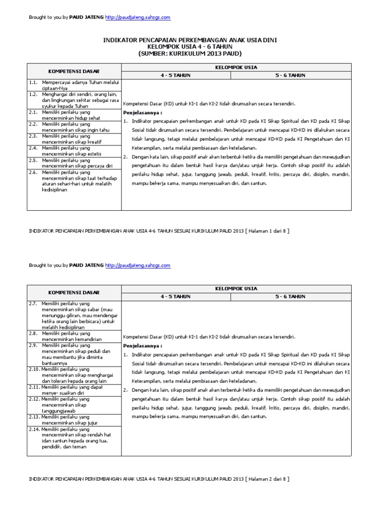 Indikator Paud Untuk Anak Usia 4 6 Tahun Kurikulum 2013 Paud Jateng