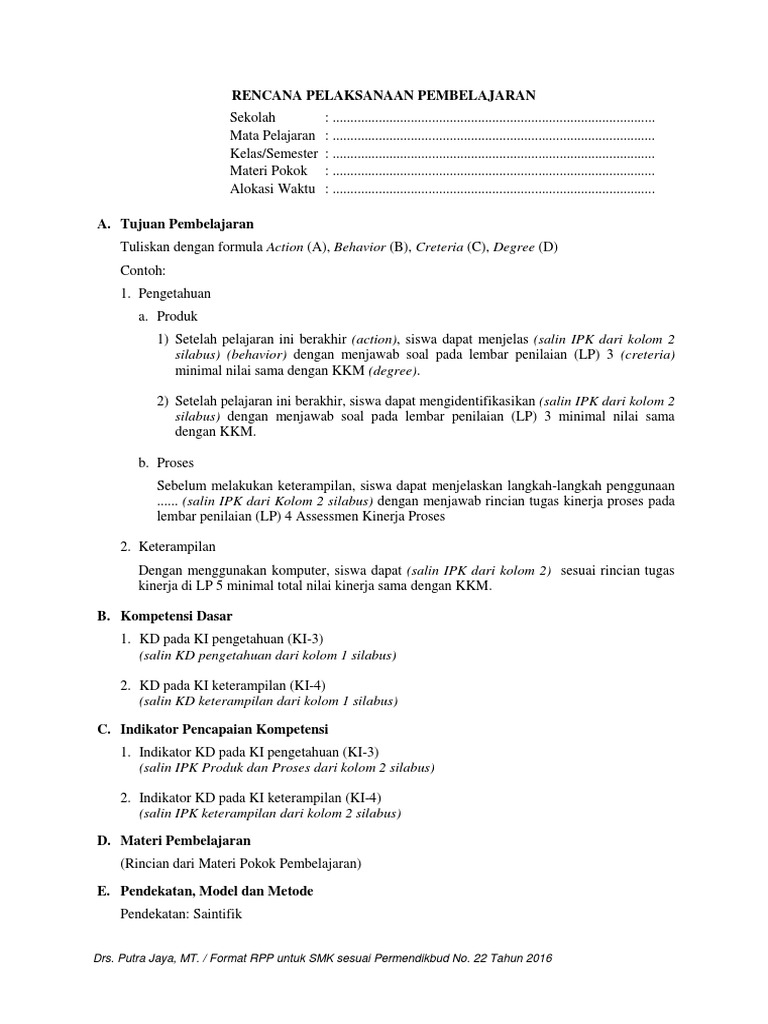 Model Format Rpp K 13 Revisi Permendikbud No 22 Tahun 2016 Pdf