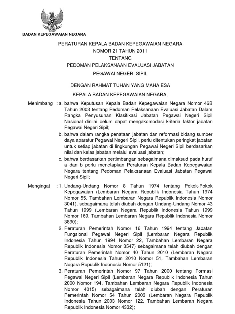 Perka bkn no 21 tahun 2010 pdf. PERATURAN KEPALA BADAN KEPEGAWAIAN NEGARA. Keputusan Kepala Badan Kepegawaian Negara Nomor 46B Tahun 2003 tentang Pedoman Pelaksanaan Evaluasi Jabatan dalam Rangka Penyusunan Klasifikasi Jabatan Pegawai Negeri Sipil Nasional Tentang. Silahkan download Peraturan Menteri Hukum dan Hak Asasi Manusia Nomor 21 Tahun 2021 melalui link di bawah ini.