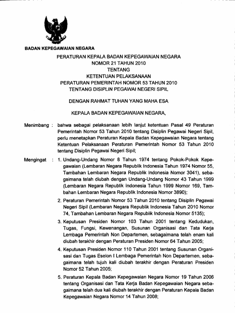 Perka Bkn Nomor 21 Tahun 2010 Ketentuan Pelaksanaan Pp Nomor 53 Tahun 2010 Tentang Disiplin Pegawai Negeri Sipil Pdf Document
