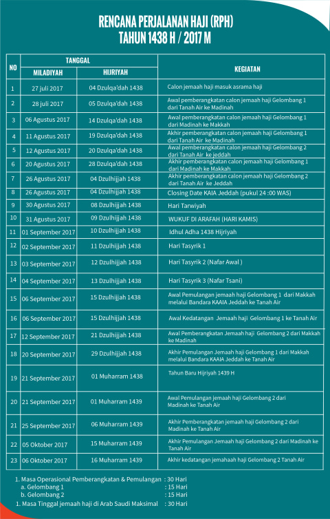 Istimewa Bagi Anda para calon jemaah haji yang kemungkinan berangkat tahun ini sebaiknya mulai bersiap. Masa operasional pemberangkatan gelombang I dari 28 Juli -11 Agustus 2017. Coba refresh halaman atau clear cache terlebih dahulu.