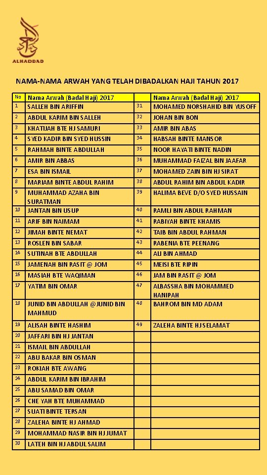 Namanama Arwah Yang Telah Dibadalkan Haji Tahun 2017